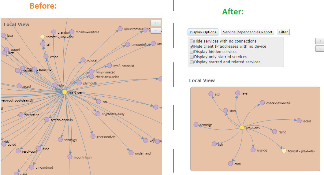 The below is a before and after topology of the same server after hiding common services. The results are dramatic, indeed!