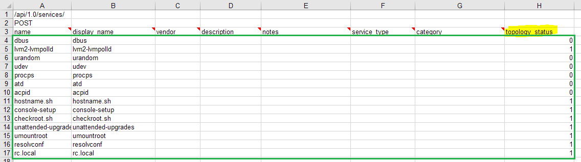 - Copy the service names and topology status column data from your CSV to the sample api_services.xls file you downloaded: