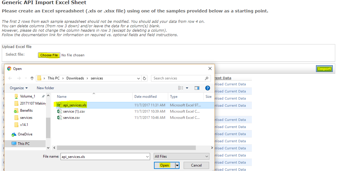 - Open the downloaded “services.csv” spreadsheet, and the newly downloaded sample api_services.xls sheet: