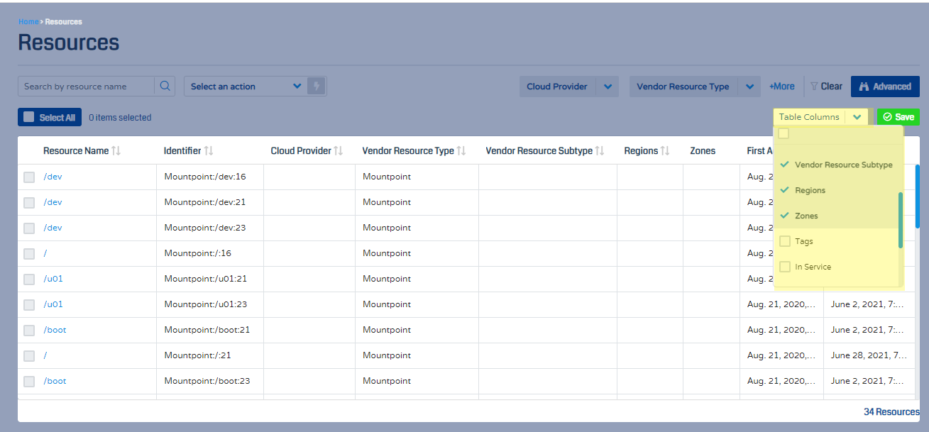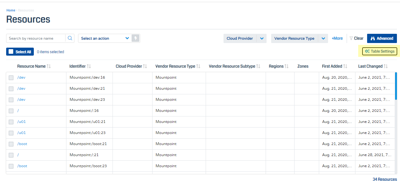 In v17.03.00, the Resources list page now includes a Table Settings option you can use to select the columns you want the page display to make it easier to get at the information you want or need. On the list page, click Table Settings.