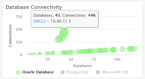 The v17.03.00 dashboard now includes new widgets that display a pie chart for Affinity Group Categories (Application Layer, Database, Load Balancer, Web Server, and Other) and a scatter plot chart for Databases and Database Connections. Links in each chart take you to the relevant Affinity Group or Database pages.