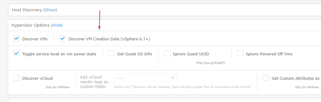 - Customers can now select the Discover VM Creation Date (vSphere 6.7+) option when creating Hypervisor/*nix/Windows VMware autodiscovery jobs.