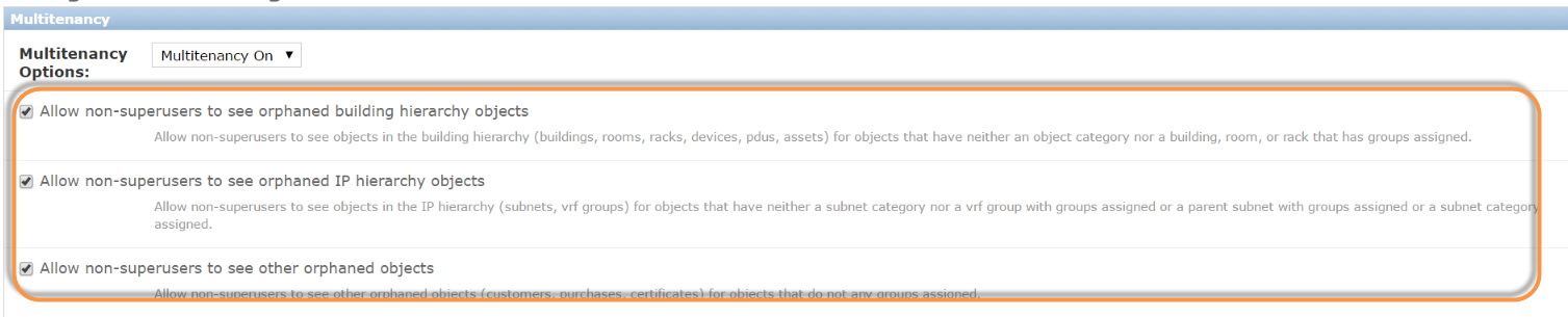 An “orphaned object” is an object (e.g. a rack or a subnet) that has no group assigned to it directly AND has no group assigned to a “parent object”. To refresh your memory, the parent objects of racks are rooms and buildings and the parent objects of subnets are their parent subnets and vrf groups. Prior to this release, orphaned objects could not be viewed by any non-superuser.