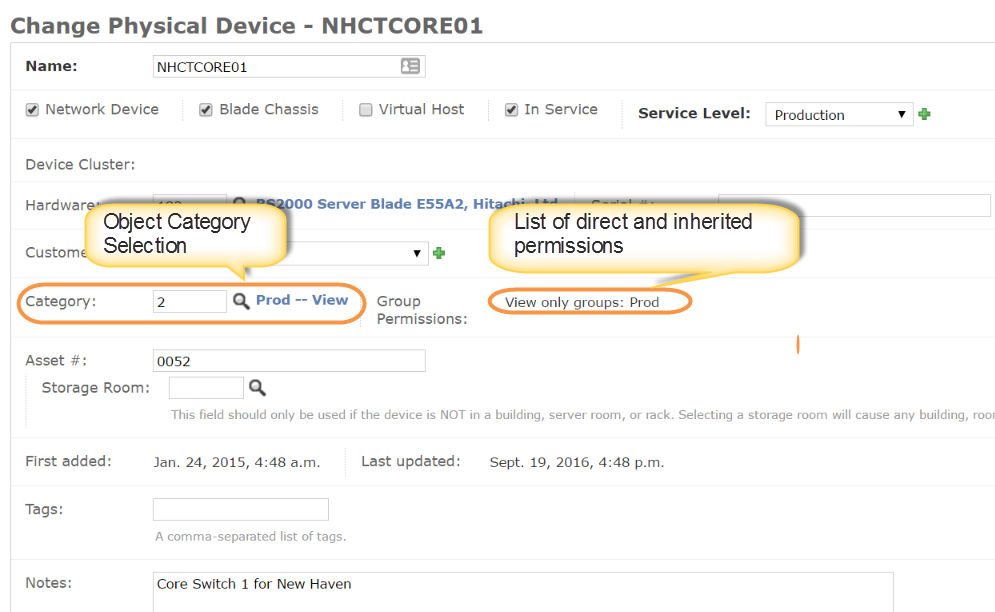 In this release, you will no longer see a Groups section on the view and edit pages of devices, assets, and PDUs. Instead, you will see an Object Category drop-down: