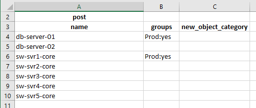 There is a tab for devices, one for assets, and one for PDU’s (The groups for each will be listed). The simplest approach (though not necessarily the best approach), is to define an Object Category for each unique entry in the groups column. Then enter this category in the new_object_category column.