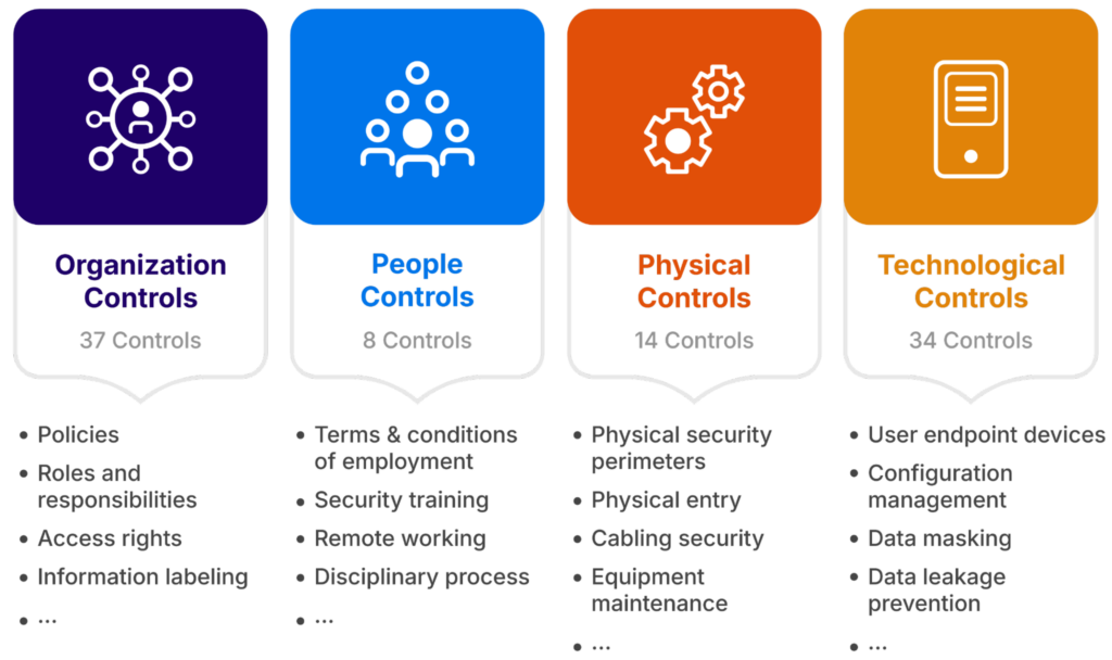 The current version of this standard, ISO 27001:2022, is organized around a set of 93 controls outlined in Annex A, which are grouped into four categories: