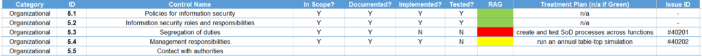These designs don’t need to be a copy of the ISO control guidelines, and this is not an expectation of the audit. The ISO control objectives should be met, but their implementation is often not managed one by one in isolation from the rest of the controls.