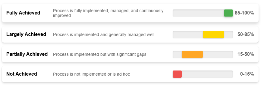 Each evaluated process should be rated on a scale from “Not Achieved” to “Fully Achieved” based on specific maturity dimensions. Moving between capability levels can differ for different organizations, but in all cases, it requires adopting a systematic approach, as outlined in the table below.